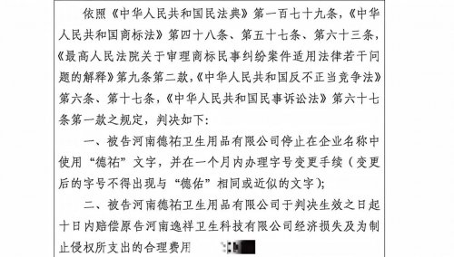 法院判决被告河南德祐卫生用品有限公司停止在企业名称中使用 “德祐” 文字,并限期办理字号变更手续;同时,被告需向原告河南逸祥卫生科技有限公司赔偿经济损失及合理维权费用。